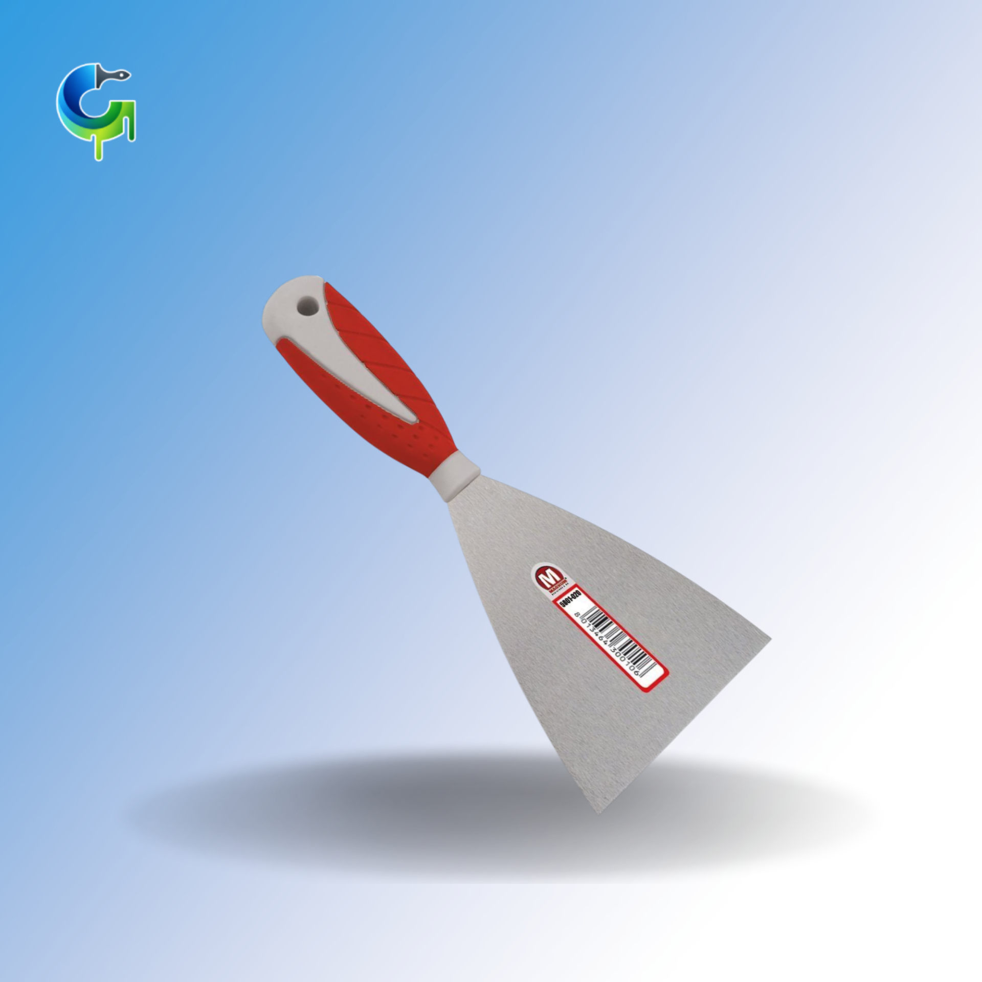 Spatola in acciaio con manico in gomma soft-touch, adatta per stuccare, sverniciare o creare effetti decorativi.